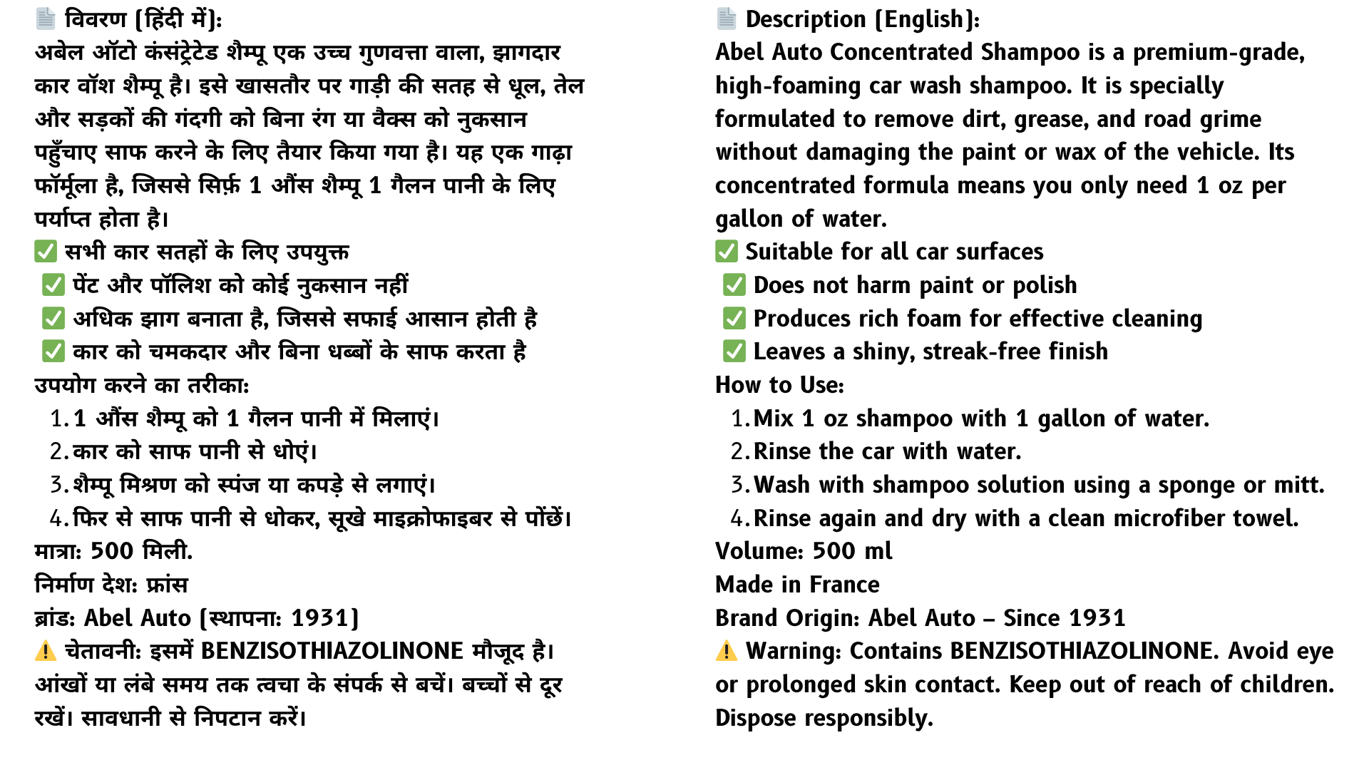 Abel Auto Concentrated Car Wash Shampoo β High Foam Formula β 500 ml (Made in France)