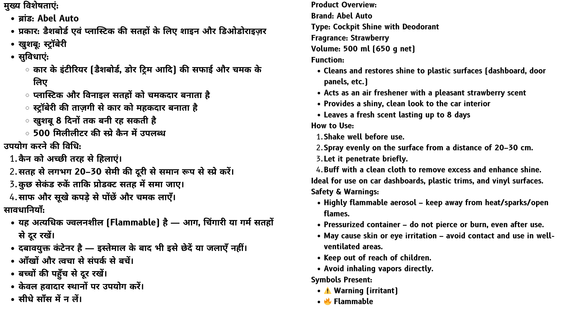 Abel Auto Shine is a premium cockpit spray designed to clean, shine, and deodorize your vehicle’s interior surfaces. Infused with a fresh strawberry fragrance, it provides a long-lasting scent that can last up to 8 days. Suitable for dashboards and plastic trims, it leaves a glossy finish while acting as an effective air freshener. Comes in a 500ml aerosol can.
