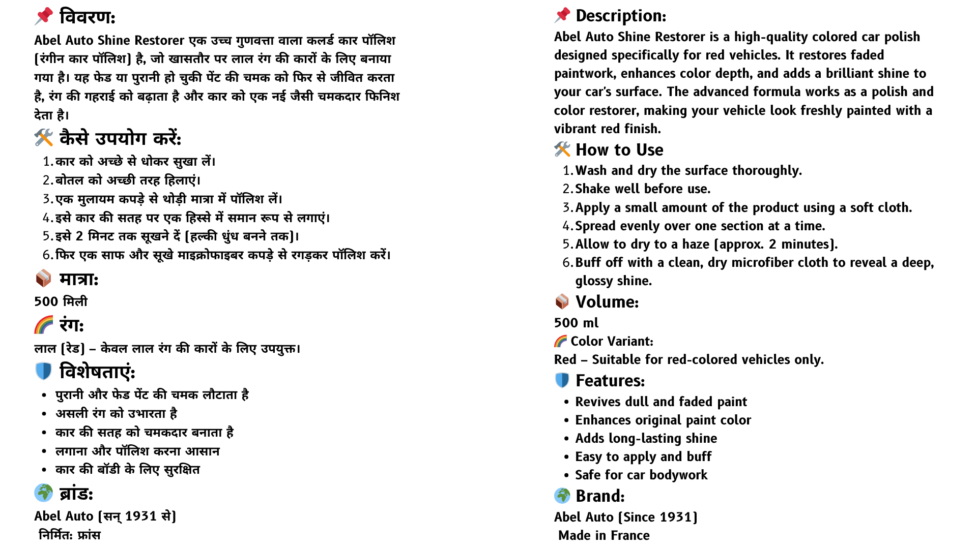 Abel Auto Shine Restorer – Red Colored Car Polish / Shine Restorer (500 ml)