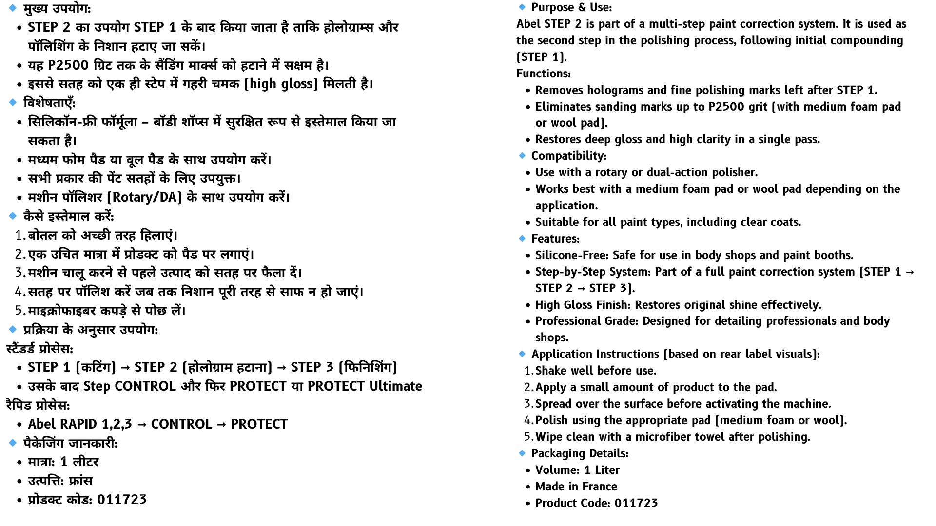 AbelAuto Abel STEP 2 is a high-performance polishing compound designed to eliminate holograms and marks left from STEP 1 polishing. Suitable for use with wool or medium foam pads, it effectively removes sanding marks up to 2500 grit and restores deep gloss in one easy step. Ideal for automotive detailing professionals, it fits perfectly into both standard and rapid polishing processes. Silicone-free and safe for body shop use. Net volume: 1 liter.