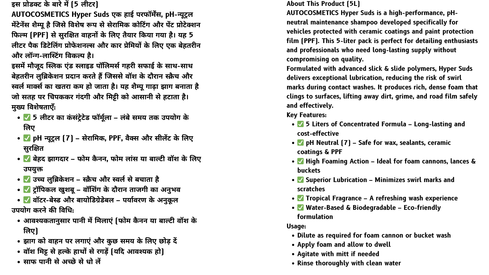 AUTOCOSMETICS Hyper Suds is a premium, pH-neutral car shampoo specially formulated for vehicles with ceramic coatings and paint protection film (PPF). Designed for maximum foam and lubrication, it safely removes dirt, grime, and contaminants without harming delicate surfaces. Infused with slick & slide polymers, it provides a smooth wash experience and leaves behind a brilliant, streak-free shine.