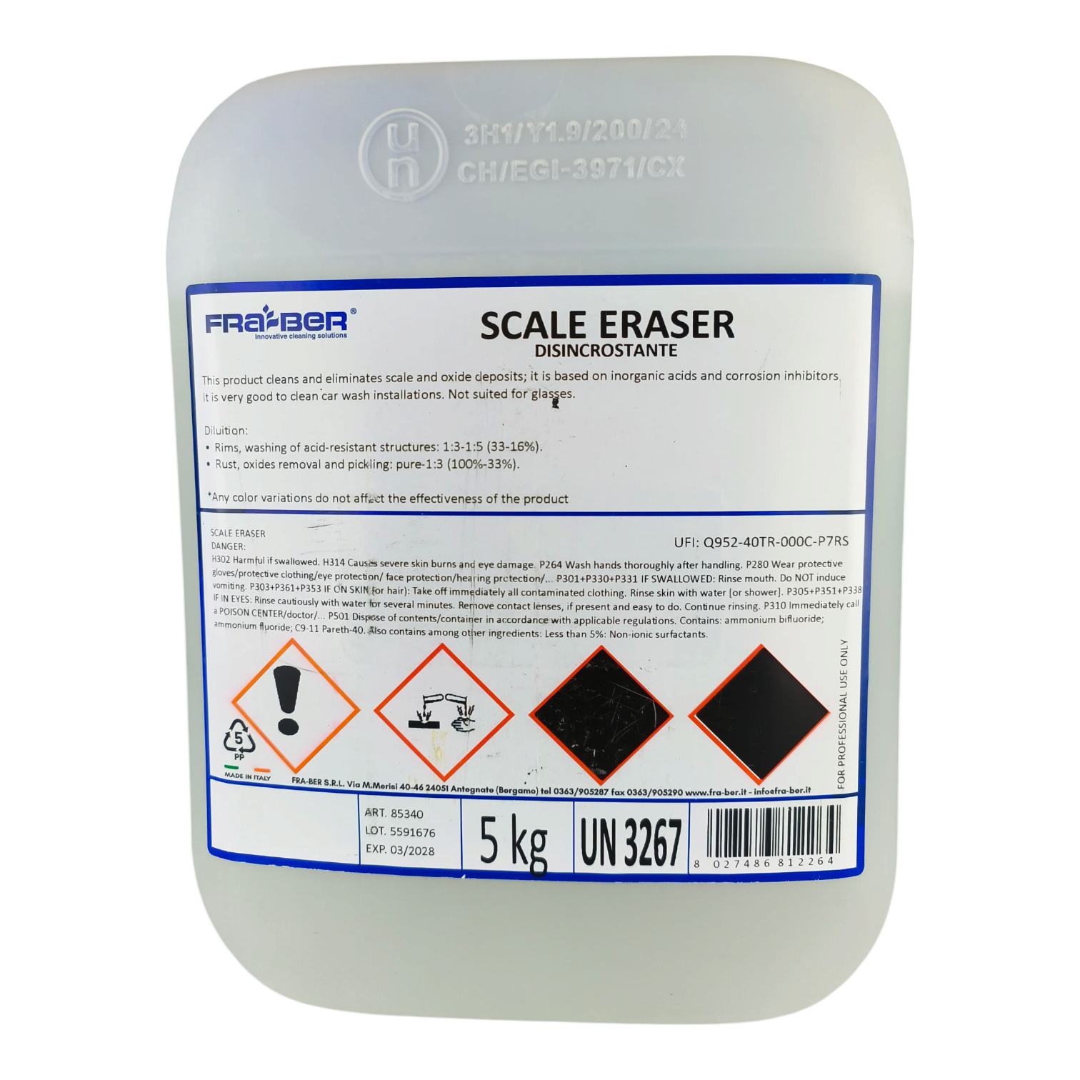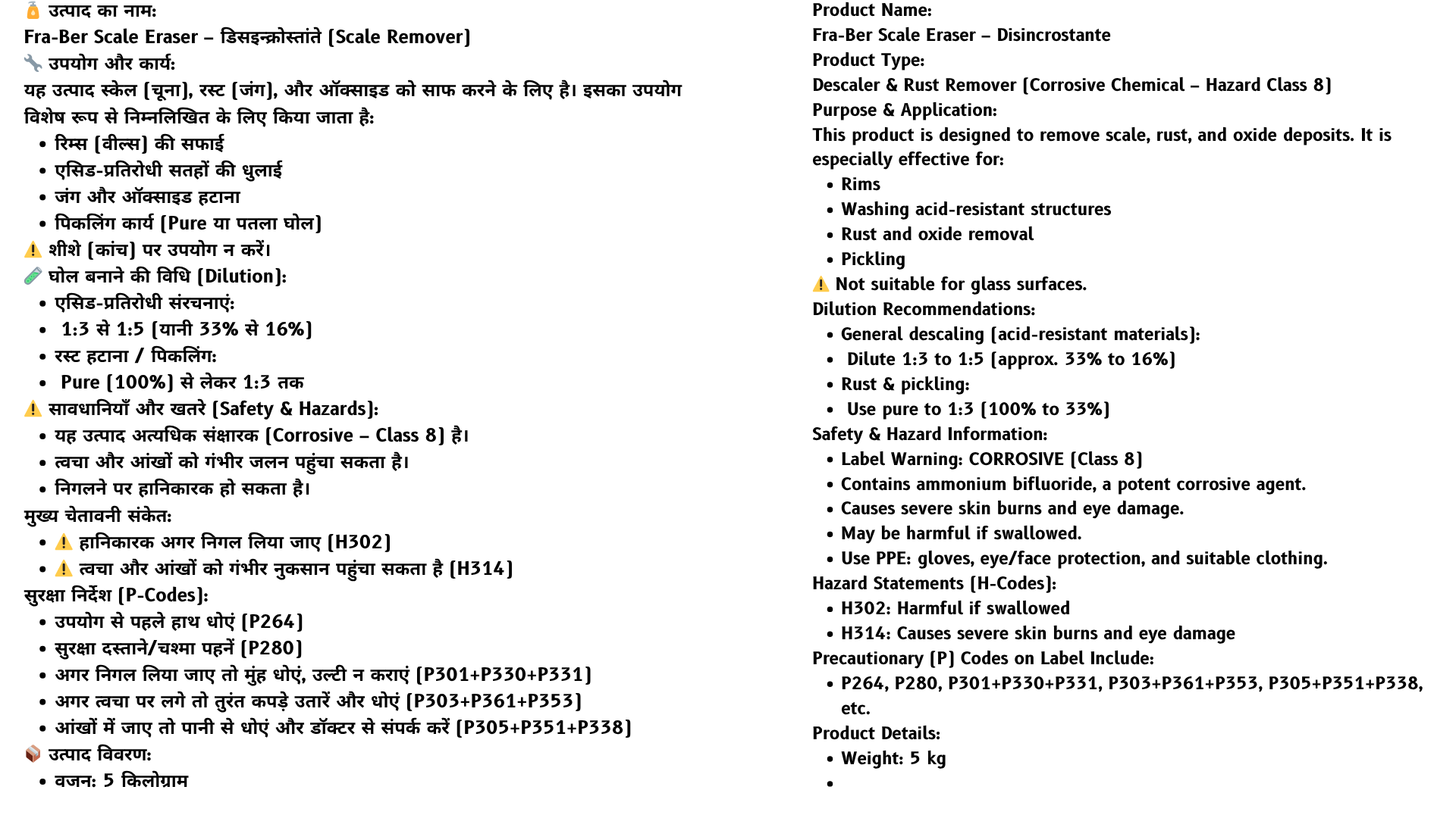 Fra-Ber Scale Eraser is a powerful descaling solution formulated with inorganic acids and corrosion inhibitors to effectively remove scale, oxide deposits, and rust. Ideal for cleaning rims, acid-resistant surfaces, and pickling applications, it is . This 5kg professional-grade product is classified as corrosive (Hazard Class 8) and must be handled with appropriate safety precautions. Always follow dilution guidelines for safe and effective use.