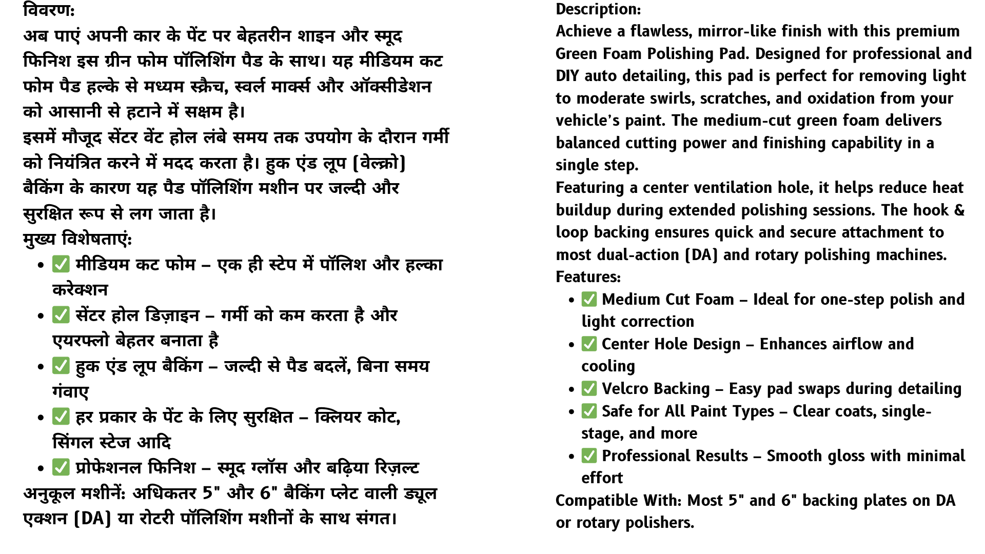 Achieve a flawless, mirror-like finish with this premium Green Foam Polishing Pad. Designed for professional and DIY auto detailing, this pad is perfect for removing light to moderate swirls, scratches, and oxidation from your vehicle’s paint. The medium-cut green foam delivers balanced cutting power and finishing capability in a single step.