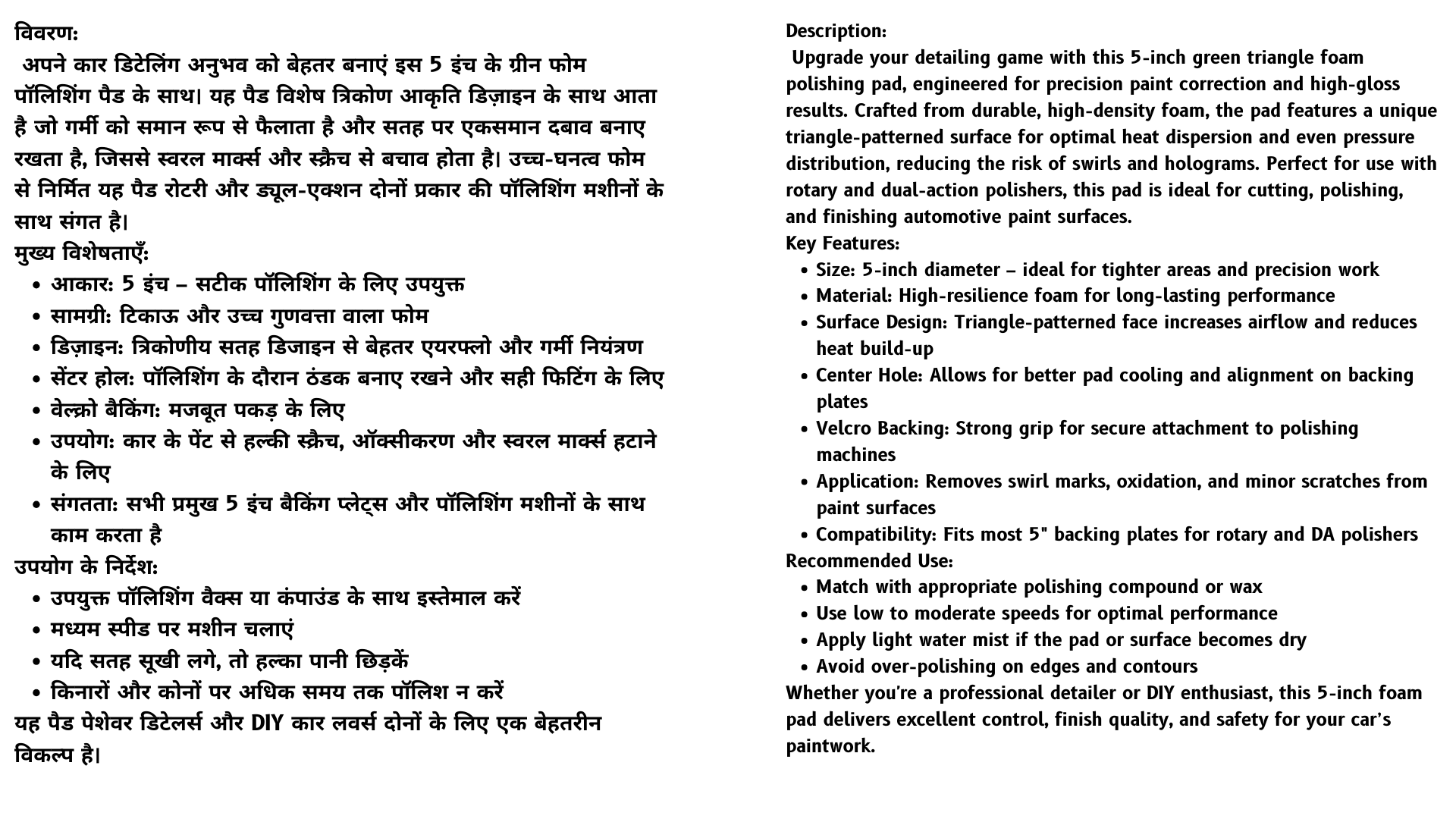 Achieve a flawless finish with this high-quality green triangle foam polishing pad. Designed for professional and DIY car detailing, this 5-inch pad features a unique triangular surface for superior heat dispersion and even polishing. The durable, high-density foam ensures consistent performance, making it ideal for removing scratches, swirl marks, and oxidation from painted surfaces. Compatible with dual-action and rotary polishers, the pad includes a center hole for heat reduction and easy alignment.